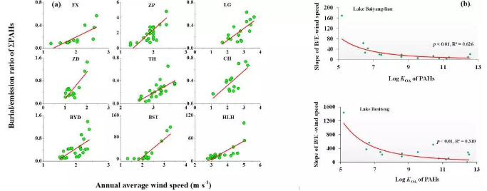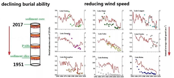 中國(guó)科學(xué)院南京地理與湖泊研究所副研究員陶玉強(qiáng)等以我國(guó)東北、西北、華北、西南、長(zhǎng)江中游及長(zhǎng)江下游9個(gè)典型湖泊(呼倫湖、博斯騰湖、白洋淀、撫仙湖、漲渡湖、朱婆湖、龍感湖、巢湖及太湖)及多環(huán)芳烴為例,通過沉積物巖芯中多環(huán)芳烴沉積通量、流域內(nèi)多環(huán)芳烴歷史排放通量、流域內(nèi)溫度、降雨量、降雨天數(shù)、風(fēng)速等歷史氣象參數(shù)、湖泊歷史水質(zhì)參數(shù)、湖泊有機(jī)碳埋藏通量等綜合分析,有效排除了富營(yíng)養(yǎng)化和多環(huán)芳烴排放量對(duì)沉積物埋藏能力的影響,在國(guó)際上發(fā)現(xiàn)了在1951年至2017年期間氣候變化引起的地表風(fēng)速降低、氣溫升高及降雨天數(shù)減少已經(jīng)使中國(guó)湖泊對(duì)16種多環(huán)芳烴的埋藏能力降低了69.17% ± 9.37% - 85.69% ± 3.57%。