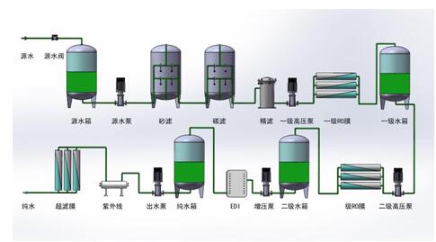 一般生活用水進(jìn)行到一級(jí)反滲透就可以了,后續(xù)的二級(jí)反滲透、精密過濾一般是工業(yè)用水包括醫(yī)療用水、電子廠等對(duì)水的純度要就高,下圖是水處理流程圖。