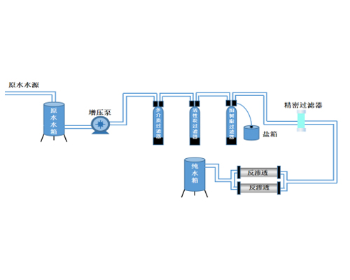 原水 → 原水加壓泵 → 多介質(zhì)過濾器 → 活性炭過濾器 → 軟水器 → 精密過濾器 → 反滲透設(shè)備 → 純水箱